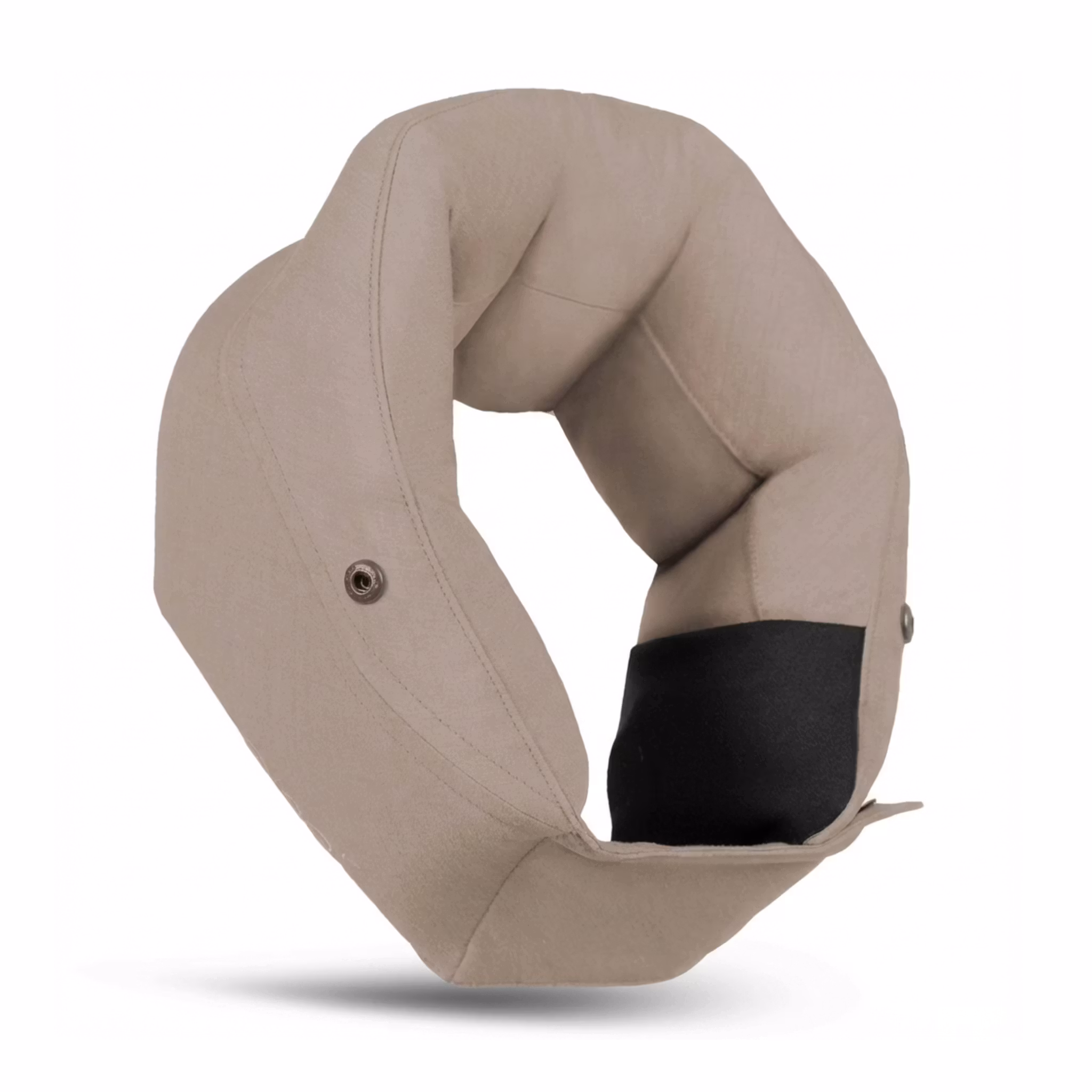 Stödet justeras enkelt genom att kombinera luftmängden i kudden tillsammans med kardborreknäppningen framtill. Knäppningen på kragen gör det möjligt att finjustera passformen efter individuella behov och önskad fasthet, så att kudden sitter stabilt och bekvämt runt nacken. Resultatet är en mer naturlig viloposition och ett tryggt stöd, även under längre resor som långflyg, tågpendling eller bilresor.